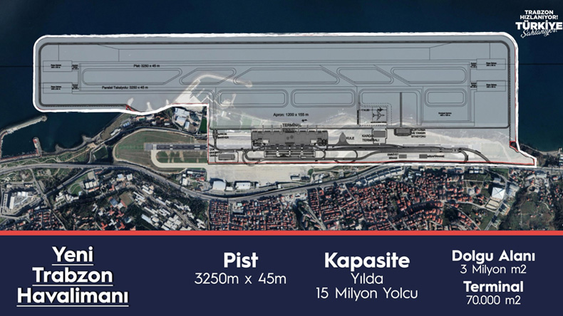Yeni Trabzon Havalimanı, yılda 15 milyon yolcu kapasitesine sahip olacak şekilde planlandı. Pist uzunluğu 3.250 metre, genişliği 45 metre olarak tasarlandı ve tamamı deniz dolgusu üzerine inşa edilecek. Projede yer alacak yeni terminal binasının ise yaklaşık 70 bin metrekarelik bir alana sahip olması hedefleniyor. Bu özellikleriyle Trabzon Havalimanı, Türkiye’nin deniz üzerine yapılacak üçüncü havalimanı olacak.