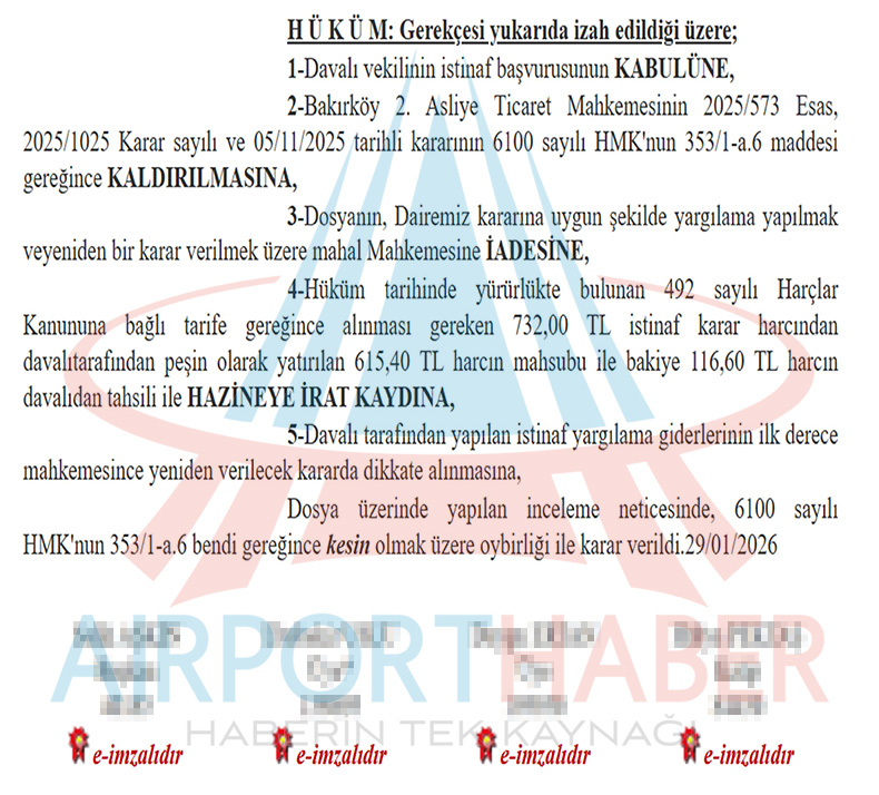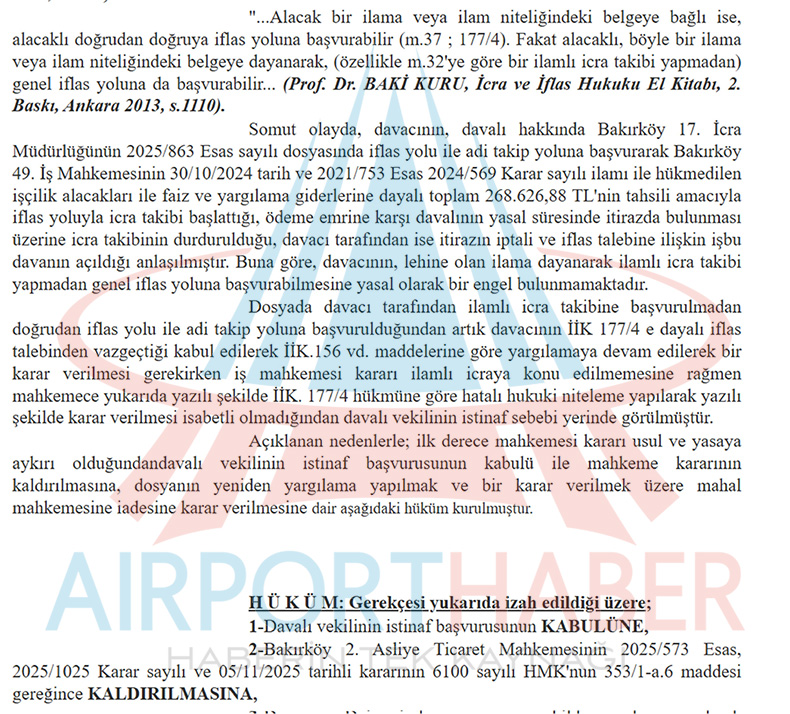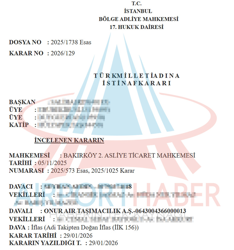 Bakırköy 2. Asliye Ticaret Mahkemesi’nin 5 Kasım 2025 tarihinde verdiği iflas kararının ardından tasfiye sürecine giren Onur Air hakkında dikkat çeken bir yargı kararı çıktı. Şirketin iflas kararına karşı İstinaf yoluna başvuran davacıların talebi üst mahkemede karşılık buldu.