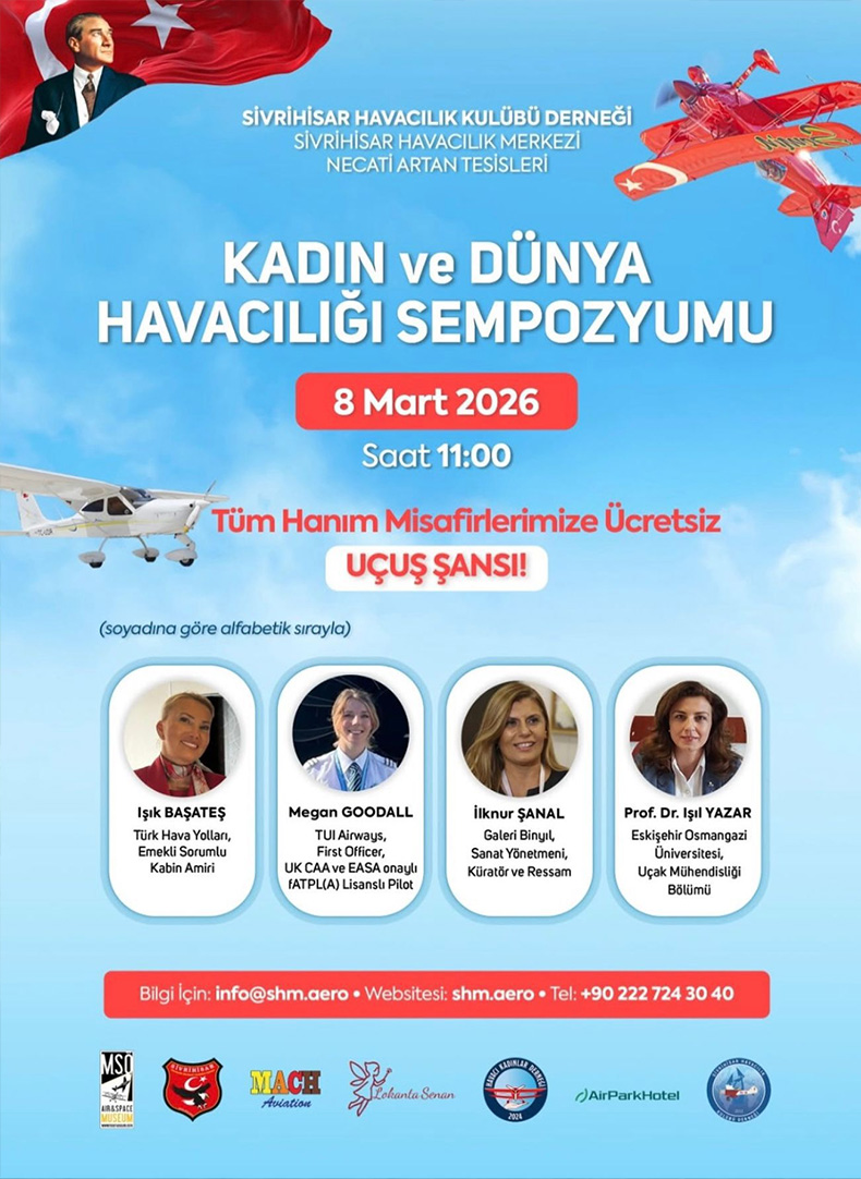 8 Mart Dünya Kadınlar Günü kapsamında, Havacı Kadınlar Derneği tarafından “8 Mart Kadın ve Dünya Havacılığı Sempozyumu” Sivrihisar Havacılık Merkezi’nde gerçekleştirildi. Havacılık sektöründe kadınların rolüne dikkat çekmek ve deneyim paylaşımını artırmak amacıyla düzenlenen etkinlik yoğun ilgi gördü.