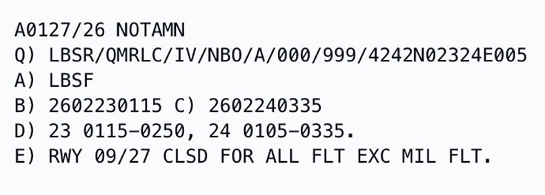 A0127/26 numaralı NOTAM'a göre, Sofya havaalanındaki 09/27 numaralı pist, Pazartesi ve Salı günleri askeri uçuşlar hariç tüm uçuşlara kapatılacak.
