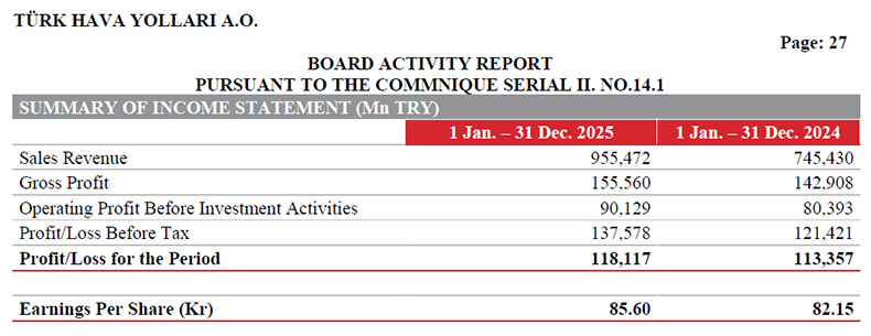 Açıklanan verilere göre THY’nin 2025 yılı satış gelirleri 955,5 milyar TL seviyesine ulaştı. Şirketin vergi öncesi kârı ise 137,6 milyar TL olarak gerçekleşti.