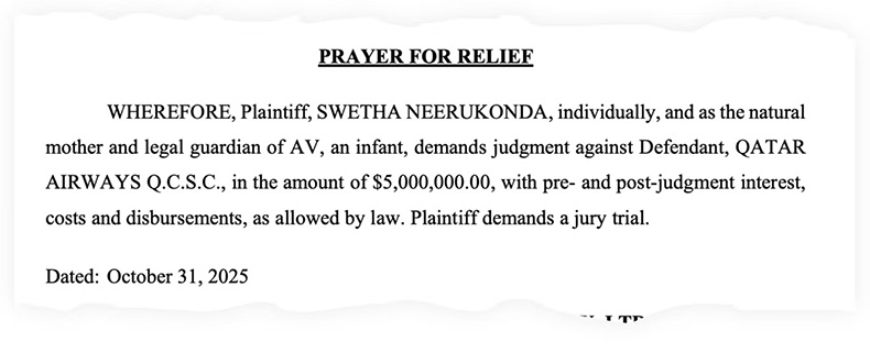 Neerukonda, jürili yargılama talebiyle 5 milyon dolar tazminat, faiz, mahkeme ve avukat masrafları talep ediyor. Şikâyette, kabin ekibinin alerji konusunda bilgilendirildiği anda çocuğa zararlı gıdaların servis edilmemesi yönünde “açık bir bakım yükümlülüğü” doğduğu belirtiliyor.
