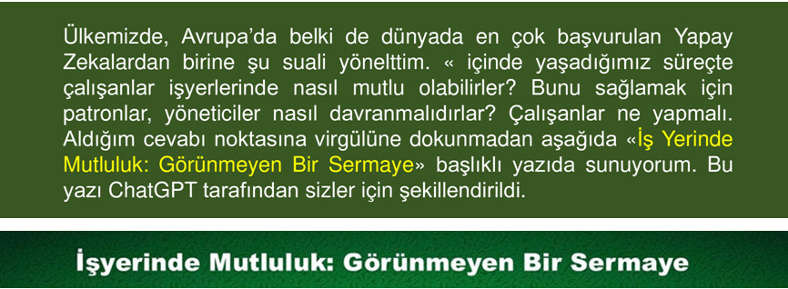 Eğer bir şirkette insanlar mutsuzsa, o kurum eninde sonunda performansını da kaybeder. Çünkü mutsuz insan yaratıcı olamaz, aidiyet hissedemez, enerjisini geleceğe taşıyamaz.