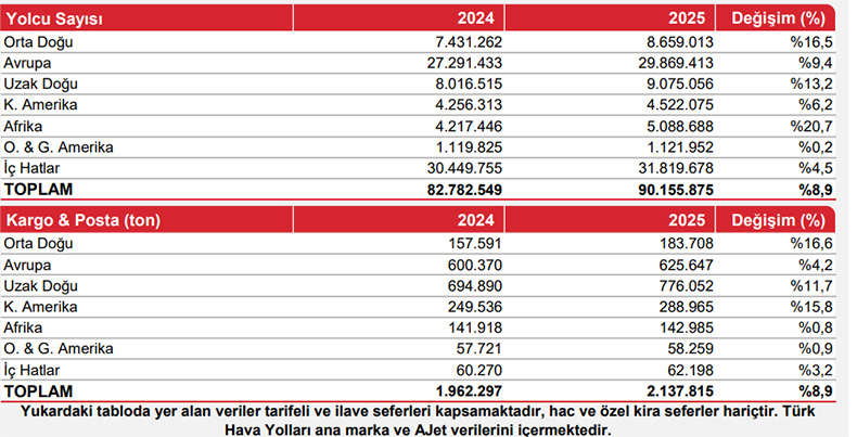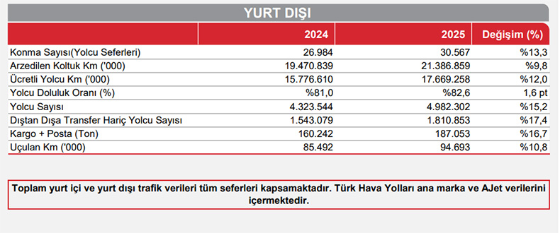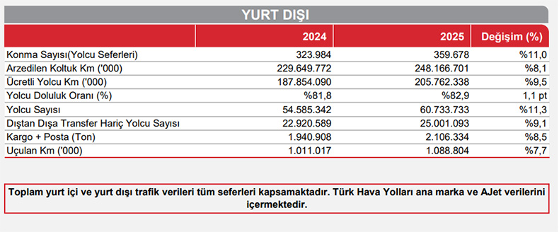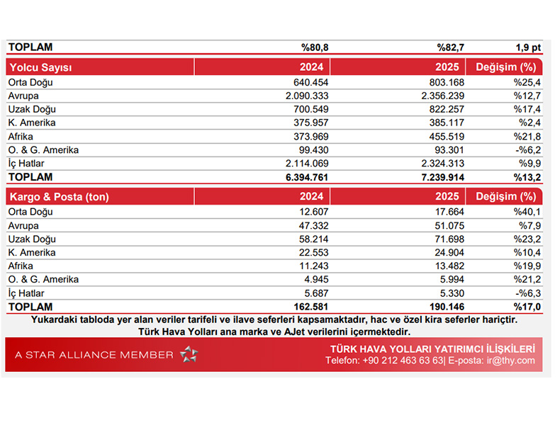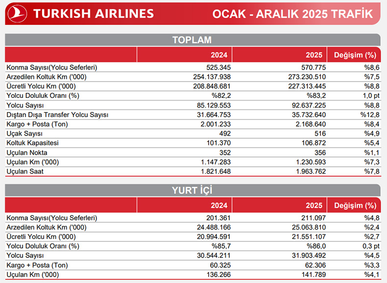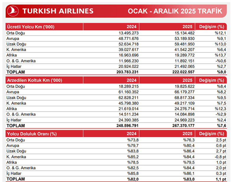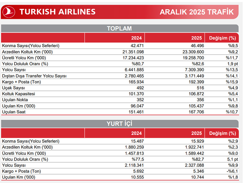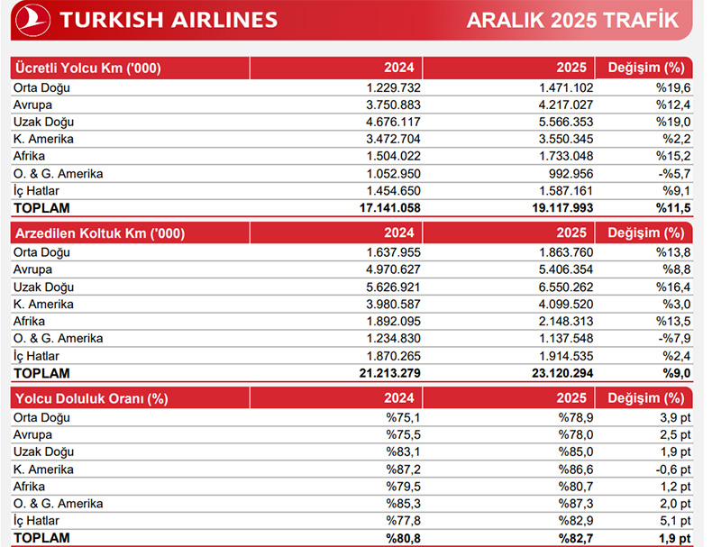 Arz edilen koltuk kilometre (AKK) bazında kapasitesinin 2024 yılının yüzde 9,2 üzerine çıkılan aralık ayında, THY'nin bu aydaki dış hat doluluk oranı yüzde 82,6, iç hat doluluk oranı ise yüzde 82,7 olarak gerçekleşti.