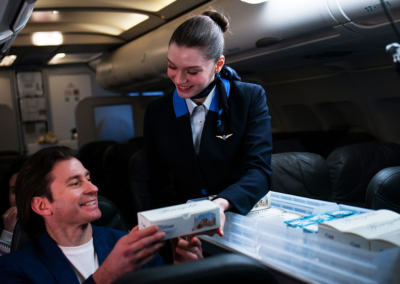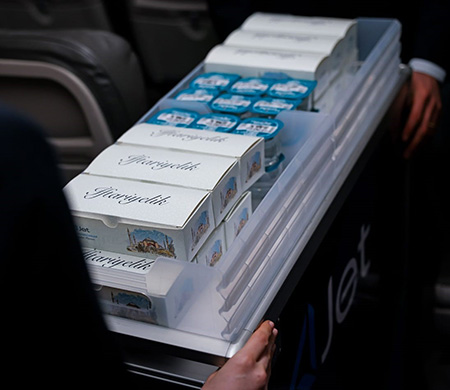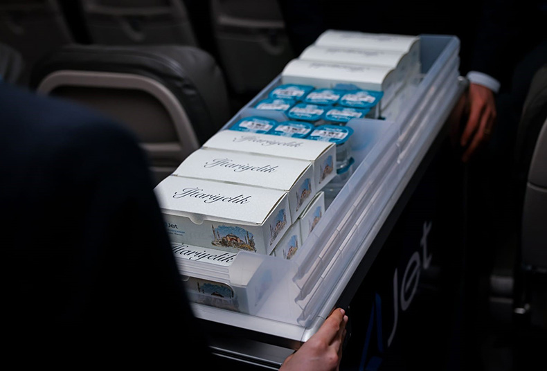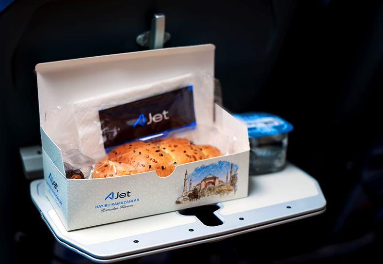 AJet'in ücretsiz iftar ve sahur ikramı, pide ekmeğinde beyaz peynir, kırmızı biber ve zeytin ezmeli sandviç, hurma ve sudan oluşuyor. Ücretsiz Ramazan ikramlarına ek olarak uçuşlarda dileyen misafirler için AJet Cafe'nin menüleri satışa sunulacak.