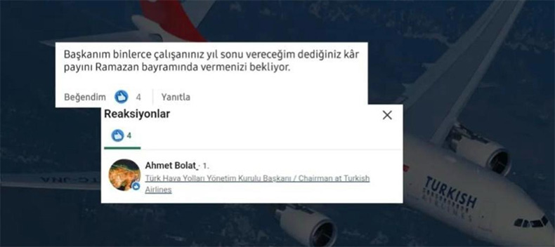 Paylaşımda, “Başkanım binlerce çalışanınız yıl sonu vereceğim dediğiniz kâr payını Ramazan bayramında vermenizi bekliyor” ifadeleri yer aldı. Dikkat çeken ayrıntı ise, Türk Hava Yolları Yönetim Kurulu Başkanı Ahmet Bolat’ın söz konusu paylaşıma “beğeni” ile karşılık vermesi oldu.