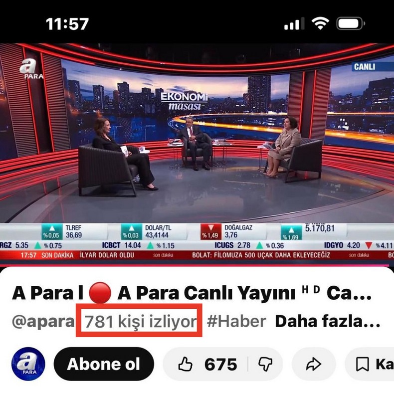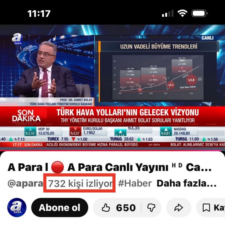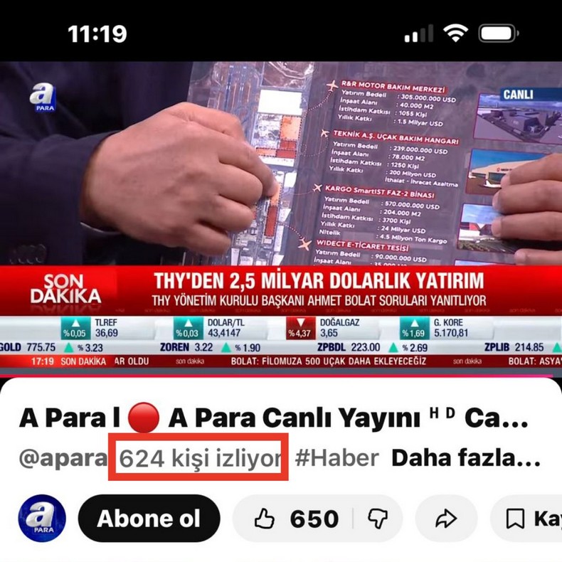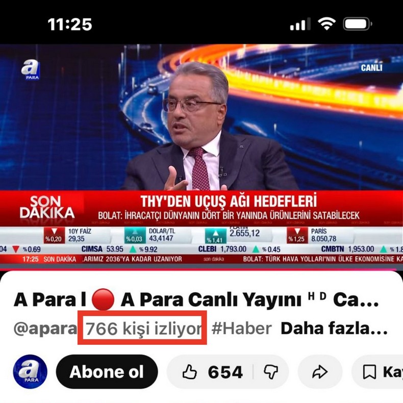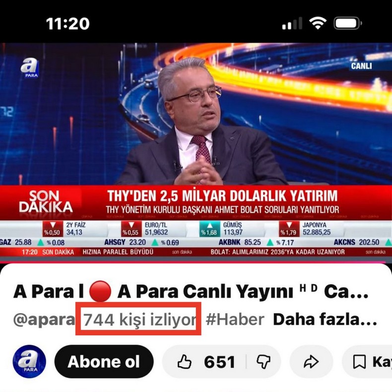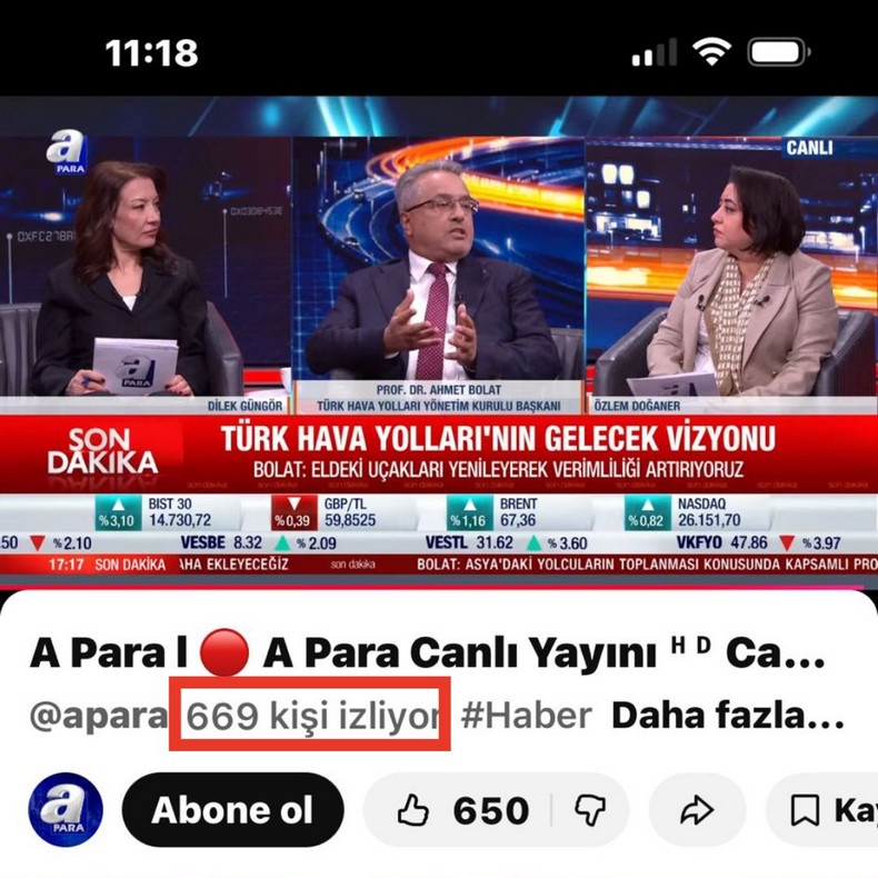 THY Yönetim Kurulu Başkanı Ahmet Bolat, bugün Ekonomi Masası programına konuk oldu. A Para ekranlarında yayımlanan program, Türk Hava Yolları Yönetim Kurulu Başkanı’nın katılımına rağmen YouTube üzerinden yaklaşık 750–800 kişi tarafından izlendi.