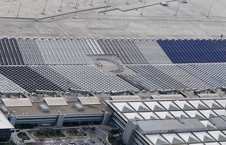 Simetrik şekilde aprona dizilen araçlar, dron ile görüntülendi. Binlerce aracın ortasında oluşturulan Türk bayrağı motifi dikkat çekti.