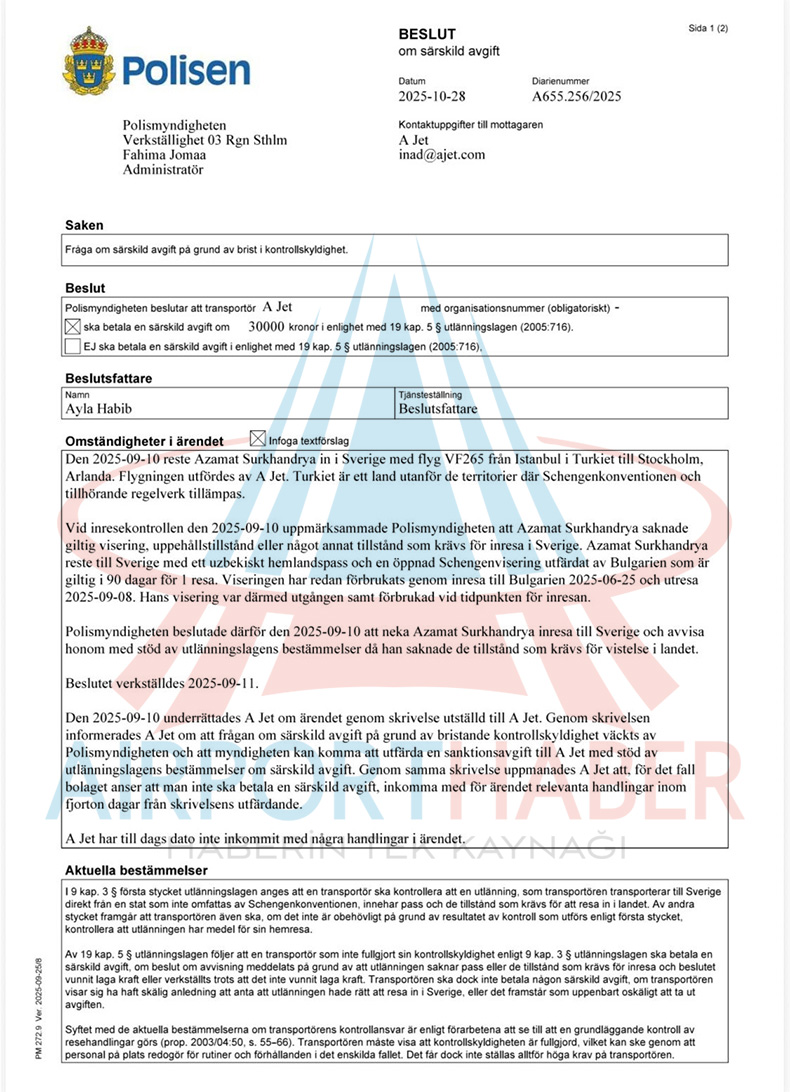 Avrupa ülkelerinden gelen idari yaptırımlar zincirine bir halka daha eklendi. AJet hakkında Almanya Federal Polisi tarafından gönderilen resmi yazıda, Almanya’ya giriş şartlarını taşımadığı tespit edilen bir yolcunun taşındığı belirtilerek taşıyıcıya açık bir talimat verildi: Yolcunun derhal geri götürülmesi istendi. Yazıda, geri taşıma işleminin aynı gün içinde yerine getirilmemesi halinde işlemin Alman makamlarınca gerçekleştirileceği ve doğacak tüm masrafların havayolu şirketine yansıtılacağı açıkça ifade edildi.