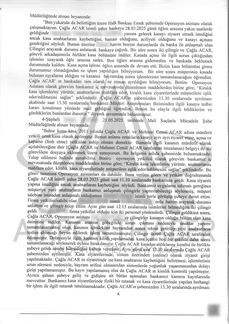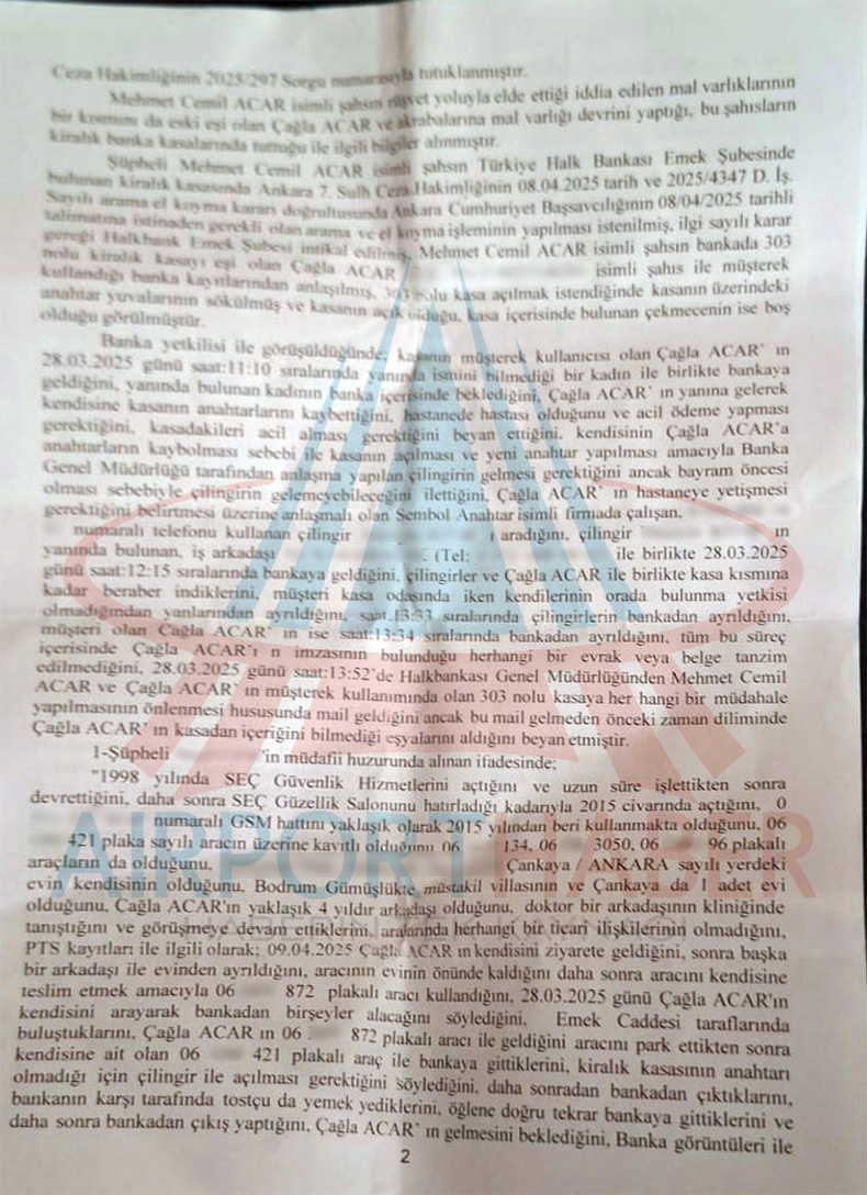 Soruşturma dosyasında yer alan ifadelere göre, Mehmet Cemil Acar’ın el koyma kararı kapsamında Halkbank’taki 303 numaralı kiralık kasasının açılması talep edildi. Ankara 7. Sulh Ceza Hakimliği’nin 8 Nisan 2025 tarihli kararı doğrultusunda yapılan işlemde, Acar’ın eski eşi olduğu belirtilen Çağla Acar’ın da adı geçti.