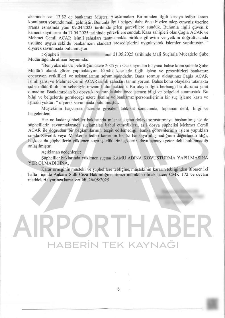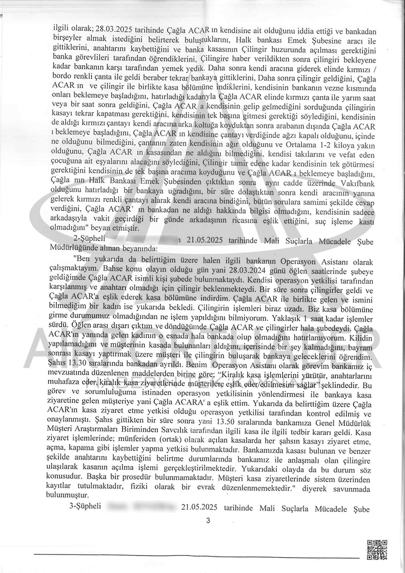 Söz konusu işlem sırasında herhangi bir belge düzenlenmediği, Çağla Acar’ın imzasının da bankada bulunmadığı dikkat çekiyor. Belgede, 28 Mart günü saat 13.52’de bankadan ayrıldıkları, ardından banka genel müdürlüğüne yapılan bilgilendirmede “kasanın boş olduğu” yönünde bilgi verildiği ifade ediliyor.