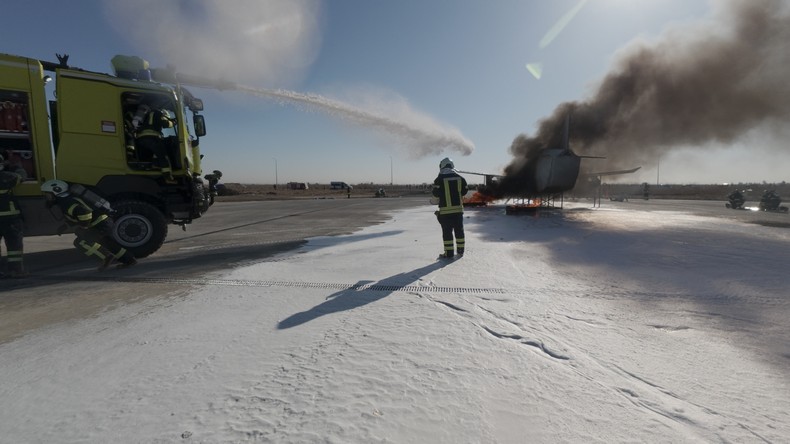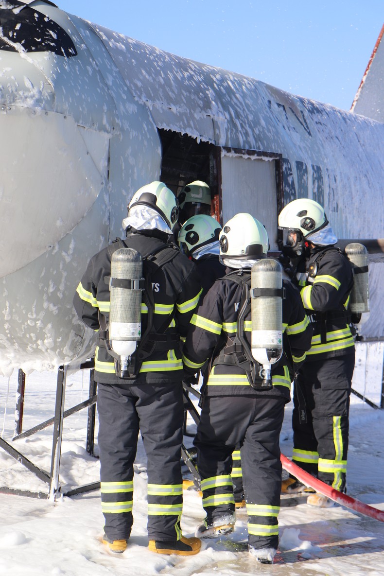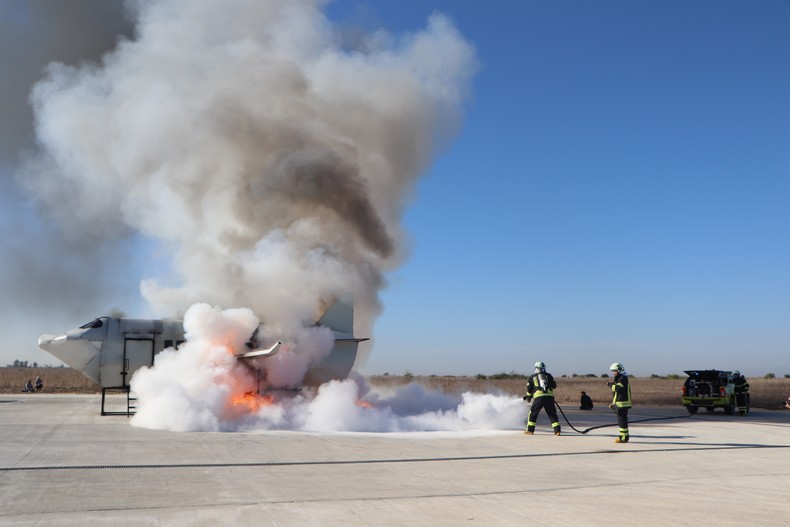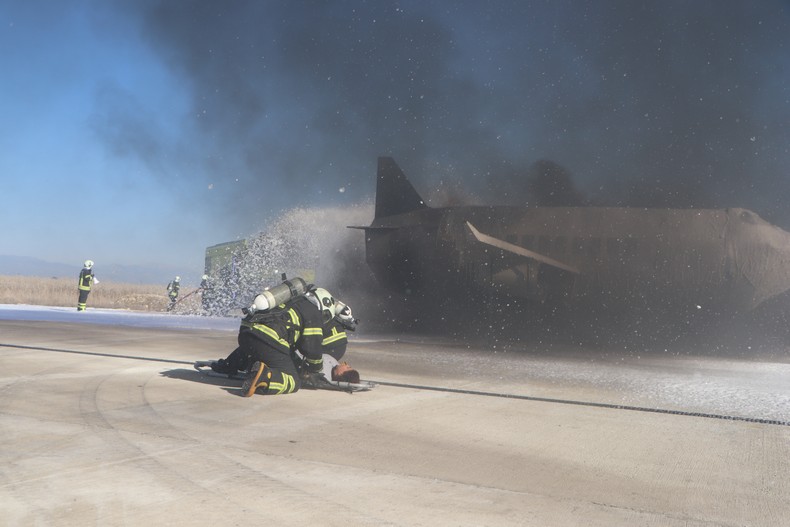 Alarm durumuna geçen Havalimanı Kurtarma ve Yangınla Mücadele (ARFF) ekipleri, kısa sürede olay yerine ulaştı. ARFF ekip liderinin ilk değerlendirmesinde, rüzgârın 21 pist yönünden 5 knot kuvvetinde estiği, uçağın sağ kanadının yanmakta olduğu ve mürettebatın kapıyı açarak acil tahliye slaydını aktif ettiği belirlendi. Yolcular slayt üzerinden tahliye edilirken yaralıların olduğu, ayrıca uçak içinde mahsur kalan yolcu ve mürettebatın bulunduğu senaryo gereği tespit edildi.