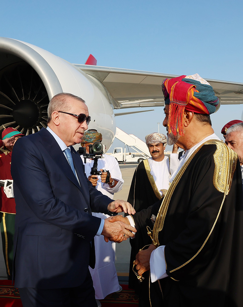 Cumhurbaşkanı Recep Tayyip Erdoğan, Katar temasları kapsamında Katar Emiri Şeyh Tamim bin Hamad Al Thani tarafından resmi törenle karşılanmasının ardından ikili ve heyetler arası görüşme gerçekleştirdi. Katar Emiri Şeyh Al Thani ile Türkiye-Katar Yüksek Stratejik Komite 11. Toplantısı'na başkanlık eden Cumhurbaşkanı Erdoğan, Katar'ın ardından Umman'a geldi. Cumhurbaşkanı Erdoğan, Özel Sultanlık Havaalanı'nda Umman Sultanı Heysem bin Tarık Teymur El Said ve Türkiye'nin Maskat Büyükelçisi Muhammet Hekimoğlu ve elçilik personeli tarafından karşılandı. Erdoğan, havalimanının ardından Al-Alam Sarayı'na geçti.