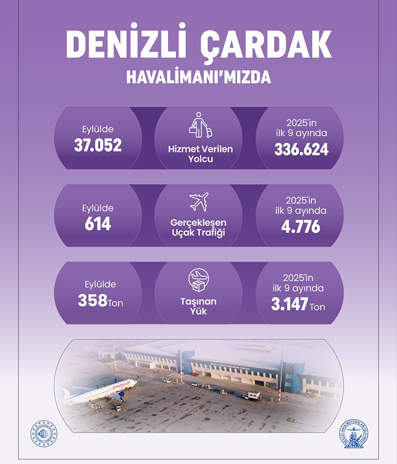 Devlet Hava Meydanları İşletmesi (DHMİ) verilerine göre Denizli Çardak Havalimanı, 2025 yılının ilk 9 ayında 336 bin 624 yolcuya, 4 bin 776 uçak trafiğine ve 3 bin 147 ton yüke ev sahipliği yaptı.