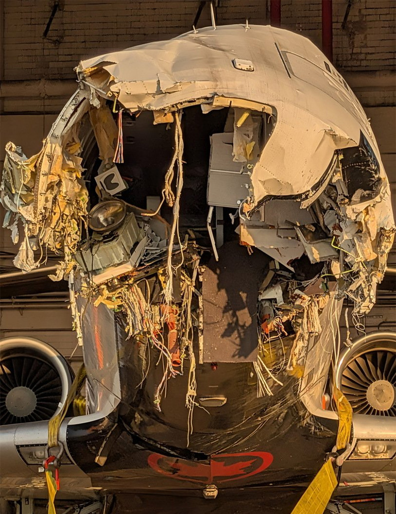 Air Canada Express'e ait kazaya karışan Bombardier CRJ-900 tipi yolcu uçağının ön kısmının neredeyse tamamen yok olduğu, burun bölümünün koparak iç aksamın açığa çıktığı görüldü.
