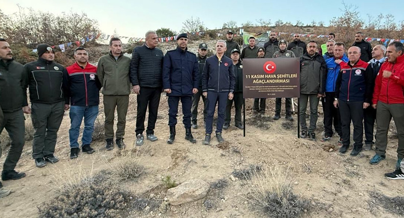 Yapılan konuşmanın ardından Vali Çiçekli ve beraberindekiler şehitlerin anısına çam fidanlarını toprakla buluştururken, '11 Kasım Hava Şehitleri Ağaçlandırma' tabelasını da dikti.