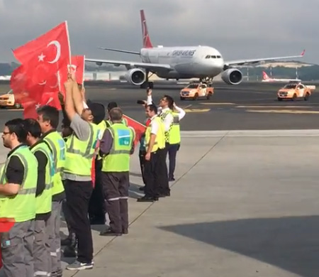 A Milli Futbol Takımımız, Türk Hava Yolları'na (THY) ait özel uçakla saat 08.30'da İzlanda'dan İstanbul'a geldi. Milli takımı taşıyan uçak apronda follow me araçları eşliğinde körüğe yanaşırken, Ay-Yıldızlı kafileyi IGA çalışanları Türk bayraklarıyla karşıladı. Apronda bekleyen iki itfaiye aracının arasına Türk bayrağı da asıldı.