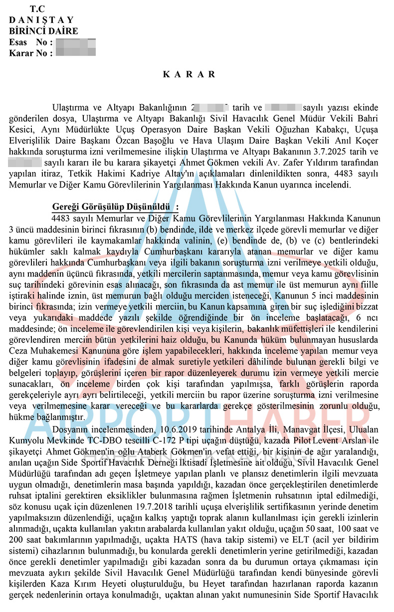 2019 yılında Antalya’nın Manavgat ilçesinde iki kişinin hayatını kaybettiği Cessna 172 kazasına ilişkin süreçte kritik bir gelişme yaşandı. Danıştay, kazayla ilgili yıllardır dile getirilen “eksik soruşturma” iddialarını resmen doğrulayarak, Ulaştırma ve Altyapı Bakanlığı’nın kamu görevlileri hakkında verdiği “soruşturma izni yok” kararını kaldırdı. Yüksek Mahkeme, dosyanın baştan ve tam kapsamlı şekilde yeniden incelenmesi gerektiğine hükmetti.