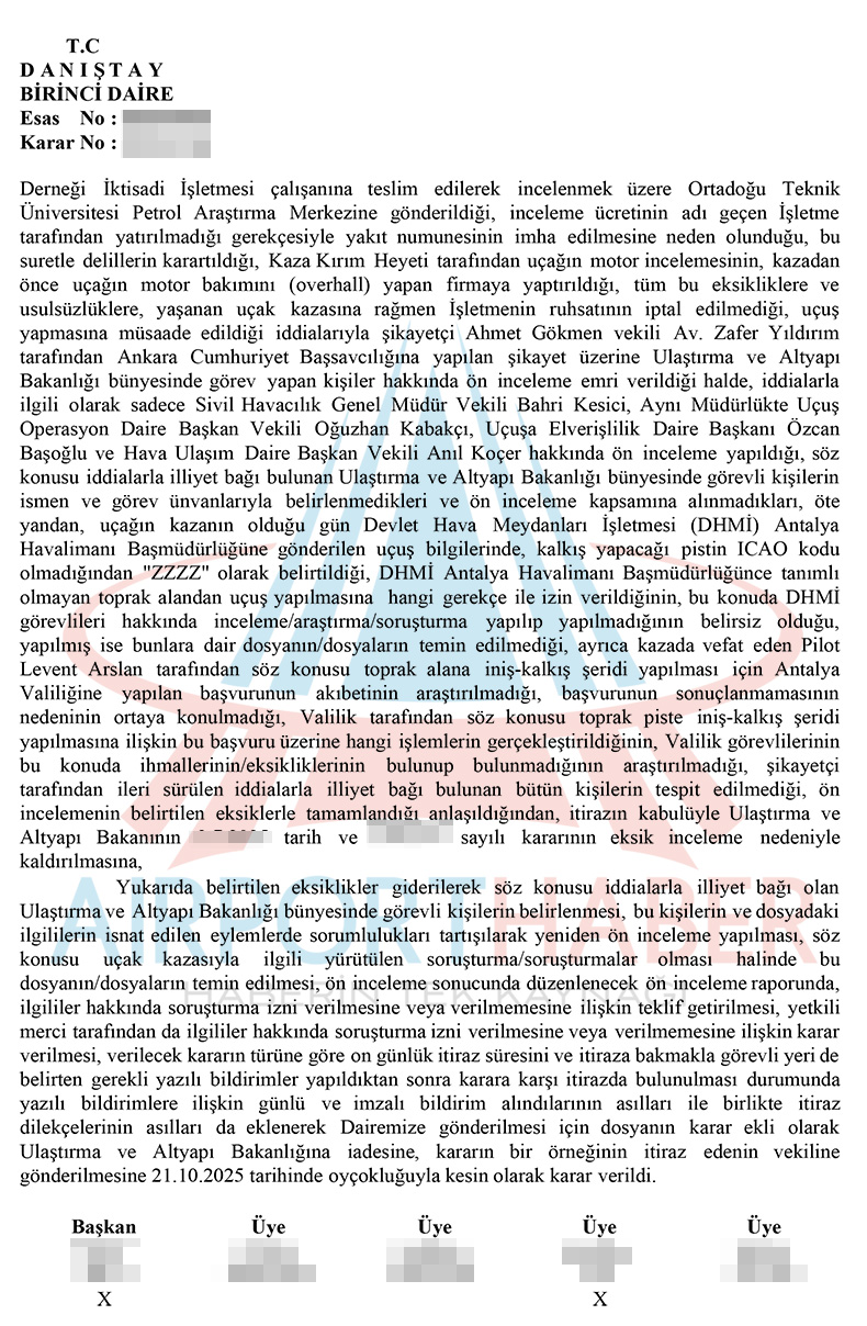 Karar metninde, kazaya ilişkin ön incelemenin yalnızca SHGM’de görev yapan dört yöneticiyle sınırlı tutulduğu, oysa olayla illiyet bağı bulunan çok daha geniş bir kamu görevlisi grubunun tespit edilmediği vurgulandı. Danıştay ayrıca, DHMİ süreçleri, pist izni prosedürleri, bakım ve uçuşa elverişlilik kontrolleri, yakıt numunesi, denetim zinciri ve kaza sonrası işlemler gibi hayati başlıkların hiçbirinin eksiksiz araştırılmadığını belirledi.