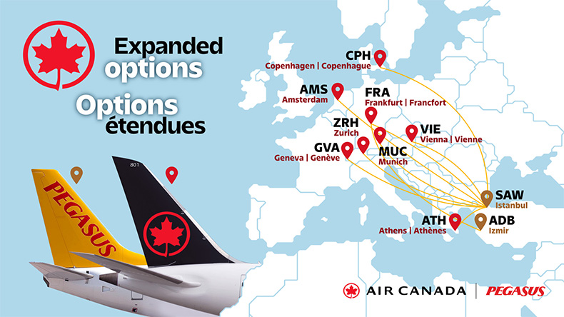 Anlaşma kapsamında Pegasus, Air Canada yolcularına Avrupa’daki önemli aktarma merkezleri üzerinden İstanbul Sabiha Gökçen Havalimanı ve İzmir Adnan Menderes Havalimanı bağlantısı sunacak. Air Canada yolcuları, Amsterdam, Frankfurt, Kopenhag, Münih, Cenevre, Viyana, Zürih ve Atina çıkışlı uçuşlarla İstanbul’a; Frankfurt aktarmalı olarak ise İzmir’e tek biletle seyahat edebilecek.