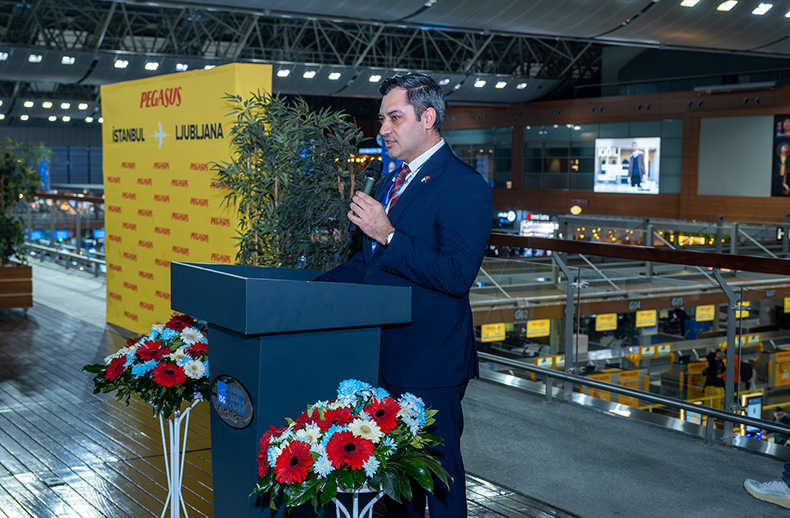 Pegasus Hava Yolları’nın, Sabiha Gökçen SAW – Ljubljana (LJU) hattının açılışı için düzenlenen törene Slovenya Büyükelçisi Gorazd Rencelj, Fahri Konsolos Mustafa Başar Arıoğlu, Pegasus Hava Yolları (PGS) Genel Müdürü (CEO) Güliz Öztürk, PGS Ticaret Genel Müdür Yardımcısı Onur Dedeköylü, PGS Satış Direktörü Emre Pekesen, ISG Ticari İşler ve Strateji Genel Müdür Yardımcısı (CCSO) Kerem Maybek, ISG Mali İşler Genel Müdür Yardımcısı (CFO) Hanita Ahmad ve terminal çalışanları katıldı.