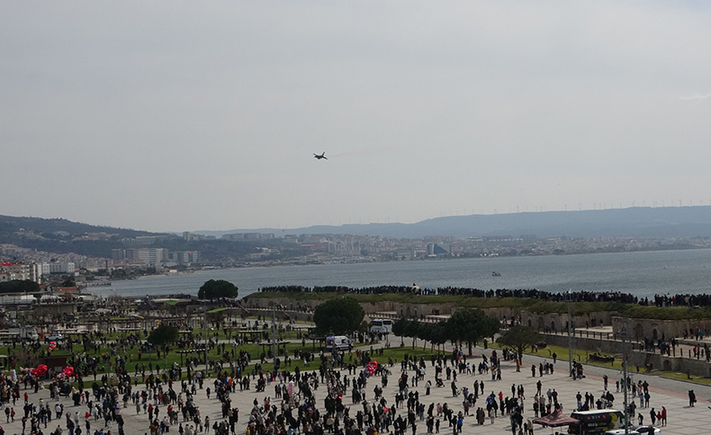 18 Mart Çanakkale Deniz Zaferi'nin 111'nci yıl dönümünde Hamidiye Tabyası önünde gerçekleştirilen gösteri uçuşunu çok sayıda vatandaş takip etti.