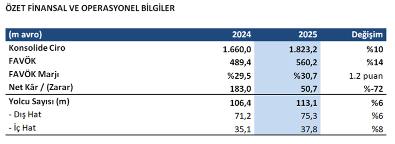 Devam eden yolcu büyümesi, Ankara’da yeni imtiyaz döneminin başlaması ve BTA’nın Antalya’da büyümesi sonucunda ciromuzu yolcu büyümesinin üstüne çıkardık. 2025 ciromuz yüzde 10 büyümeyle 1 milyar 823 milyon avro olarak gerçekleşti. FAVÖK cironun da üzerinde, yüzde 14 oranında büyüdü ve 560 milyon avroya ulaştı. Serbest nakit akışı ise yüzde 44 büyüme ile 223 milyon avro oldu. Kuvvetli nakit akışı sayesinde, yoğun bir yatırım yılında olmamıza rağmen net borcumuz yüzde 6 düşerek 1,6 milyar avroya indi. Net kâr 119 milyon avro tutarında bir kerelik nakit dışı etkilere maruz kaldı ve 51 milyon avro olarak gerçekleşti.