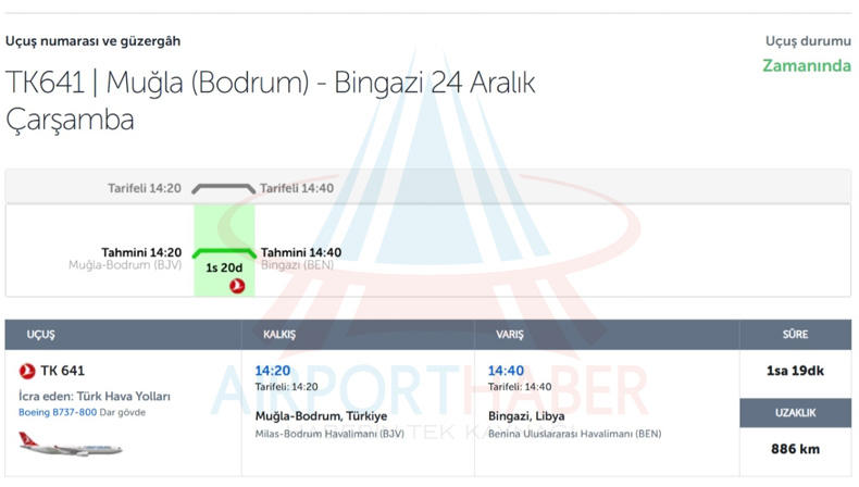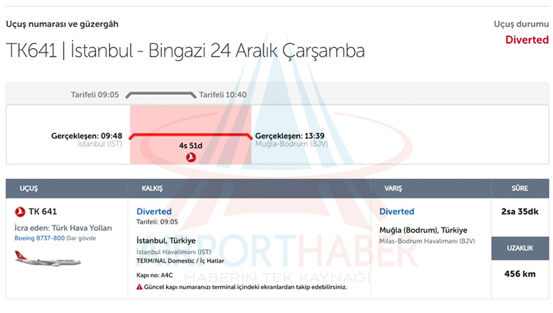 Türk Hava Yolları’nın (THY) İstanbul–Bingazi seferini gerçekleştiren TK641 sefer sayılı yolcu uçağı, Libya’ya iniş aşamasında yaşanan bir yanlış anlaşılma nedeniyle rotasını değiştirerek Milas-Bodrum Havalimanı’na iniş yaptı.