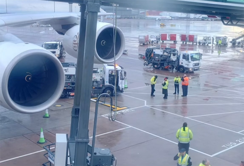 Manchester Havalimanı'nda korkutan bir kaza meydana geldi. Yapacağı Dubai seferi öncesi yakıt ikmali yapılacak olan Emirates'e ait Airbus A380 tipi yolcu uçağına yakıt kamyonu çarptı.