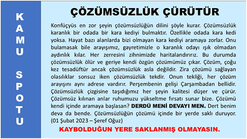 Bu nedenle bazen hayatın içindeki sorunlar öyle büyük görünür ki “Ben ne yapabilirim ki?” diye düşünürüz. Oysa çoğu zaman çözüm, büyük hamlelerde değil küçük dokunuşlardadır. Biri bir kapı kolunu tamir eder, biri bir belgeyi sadeleştirir, biri bir klasörü düzenler, biri bir gencin sorusuna cevap verir… Karanlık böyle azalır.