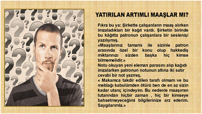 Evet, yeni yıla az kaldı. Yavaş yavaş asgari ücret, çalışanların, SSK, Bağ Kur ve memur emeklilerinin maaşları, yapılacak artımlar haberlerin ilk sırasına yerleşecek. Yavaş yavaş diyorum ama aslında mevcut enflasyon ve pahalılığa bağlı olarak söz konusu ücretlerin yazılı ve sözlü basının işlediği konular arasında en büyük yeri tuttuğu görülüyor. Ben konuyu çalışanları gülümsetecek bir fıkra ile köşeme alayım istedim.