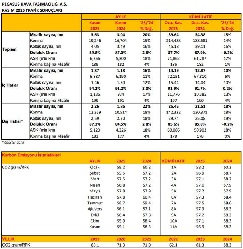 Pegasus Havayolları yılın 11 ayı için trafik rakamlarını açıkladı.