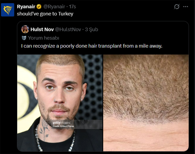 Ryanair bu paylaşıma “Türkiye’ye gitmeliydi” yorumu ekledi. Paylaşımda, saç ekimi yaptırdığı iddia edilen Justin Bieber'a ait görsel kullanıldı.