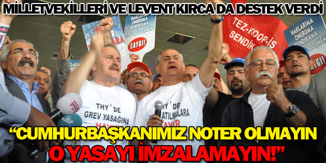 Süleyman Çelebi "İş, ekmek ve insanca yaşayacak bir ücret için hak arıyorsunuz. 18 aydır toplu sözleşme sonuçlanmıyor. THY işi mahkemede sizin haklarınızı telef ediyor. Toplu sözleşme hakkınızı kullanıyorsunuz, bunun üzerine sizi işten çıkartıyor. Gece 1:30'a kadar TBMM'de bu yasanın yanlış olduğunu, Türkiye'nin imajına zarar verecek bir yasa olduğunu anlatmaya çalıştık. Ama orada beyni olmayan o parmaklar sayesinde bu yasa şu anda Cumhurbaşkanı'na gönderildi. Biz Cumhurbaşkanımızdan şunu istiyoruz. Orada noter görevi görmeyin. Orada halkın, işçinin, emekçinin haklarını korumak için varsınız. Yasayı imzalamayın" diyerek Cumhurbaşkanı'na ricada bulundu.
