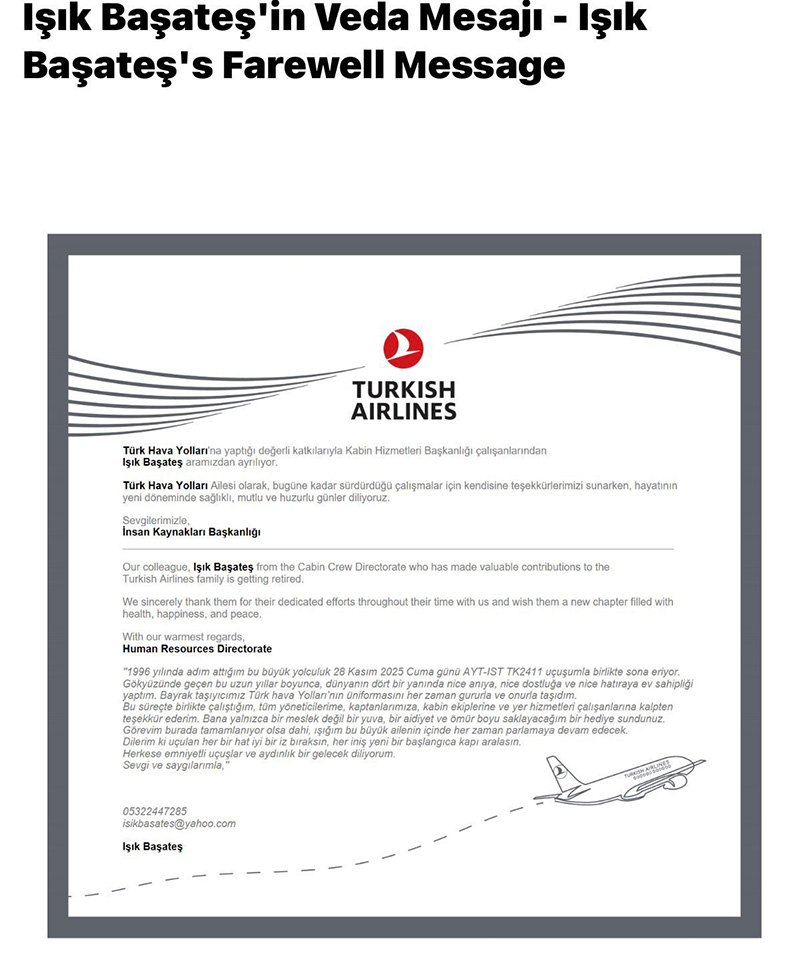 THY’de onlarca yıl boyunca binlerce yolcuya hizmet eden, genç kabin memurlarına yol gösteren ve kabin kültürünü gelecek nesillere aktaran Işık Başateş, camianın hafızasında iz bırakan bir Purser olarak yerini aldı.